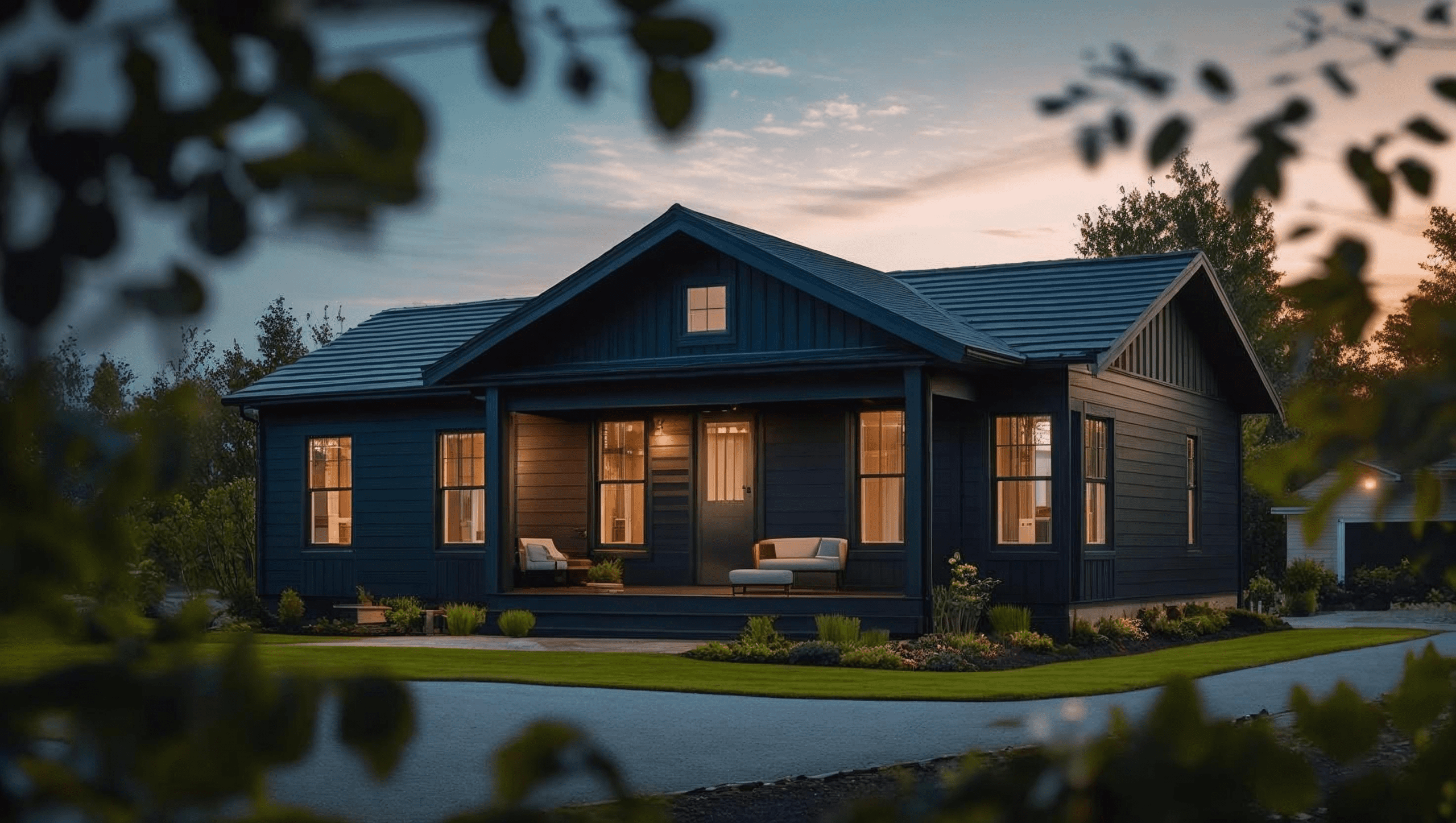 Этот дом — как вдох на закате. Он не давит своей площадью, не требует поклонения, не выпендривается фасадом. Всё просто, но со вкусом. Чёрный фасад подчёркивает стиль и независимость, а тёплый свет из окон делает его живым — как будто сам зовёт зайти.