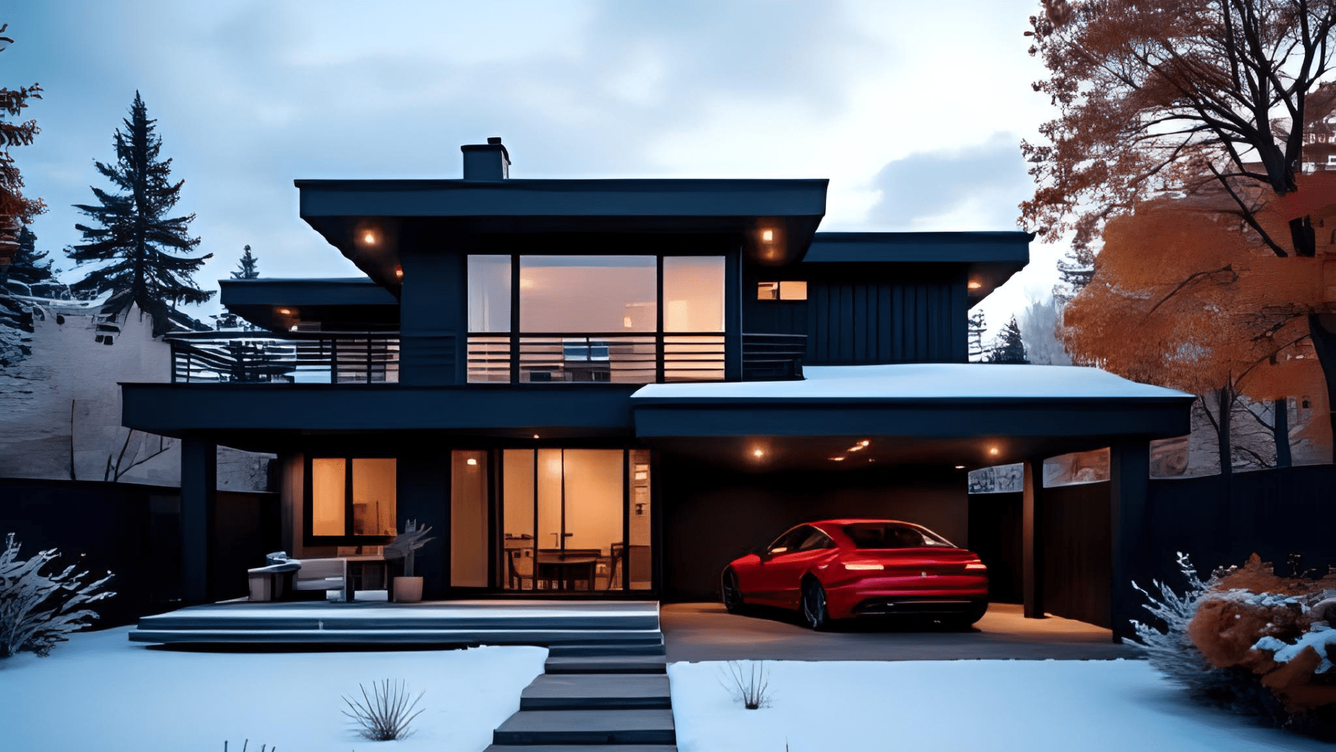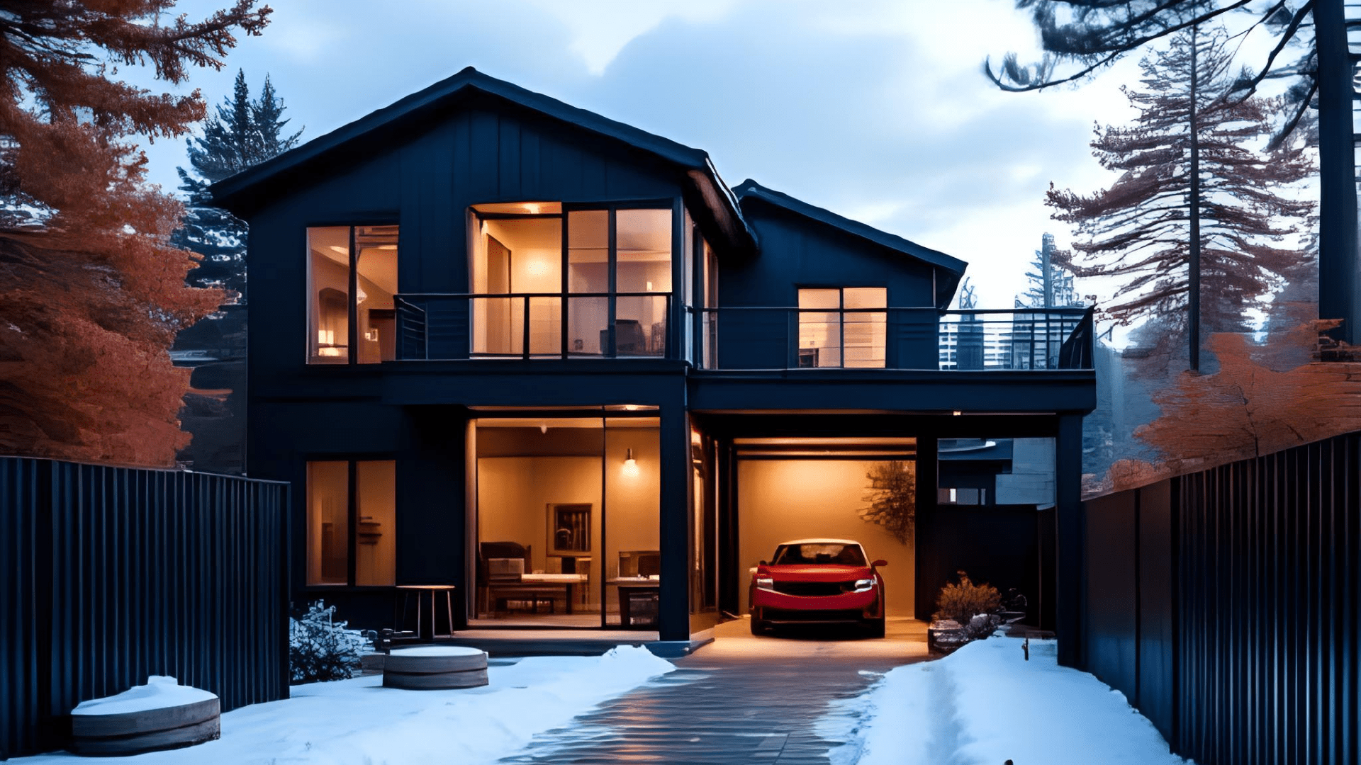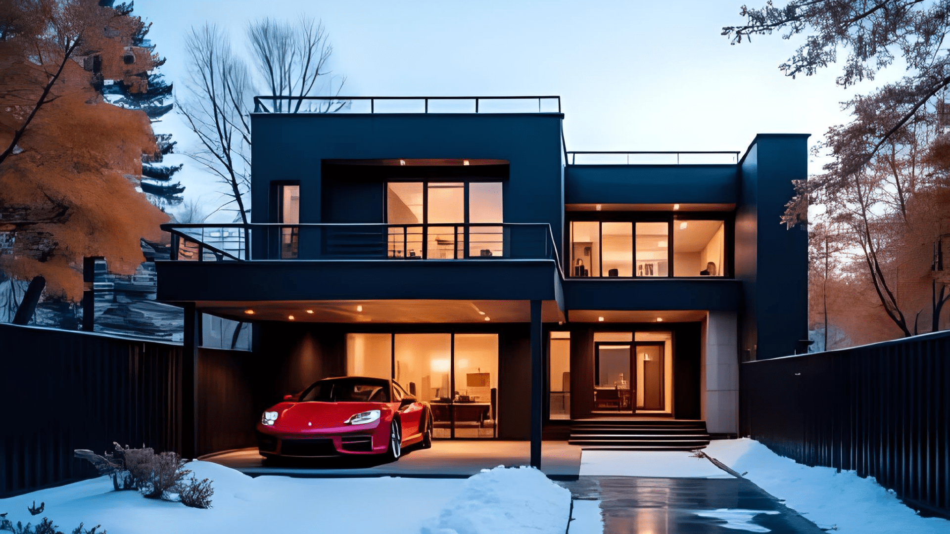 Этот дом — как строгий костюм на заказ: идеально сидит, ничего лишнего. Чёрные линии фасада, панорамные окна и холодный блеск зимы делают его не просто жильём, а заявлением о вкусе.